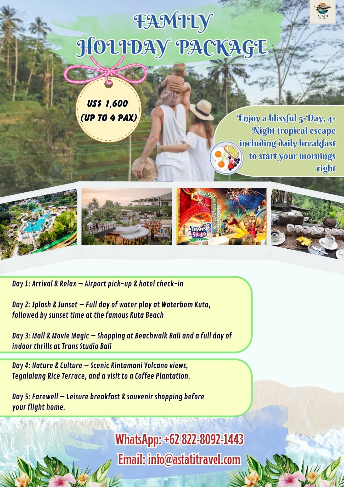 - Day 2: Splash & Sunset – Full day of water play at Waterbom Kuta, followed by sunset time at the famous Kuta Beach